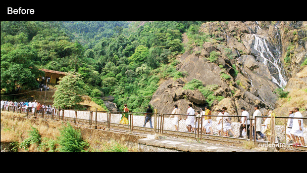 Another sequence where tranquil beauty of a setup was enhanced is train coming to a stop at a waterfall. Landscape enhancement along with waterfall took this scene to a different level. This was shot during the dry season with mostly dry vegetation and very less waterfall due to off monsoon time.