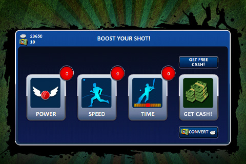 Power Ups : One-Shot bonus that the player can apply to individual shots just before initiating a batting phase.During a match, the player is presented withthree slots at the bottom right hand side of the screen. Tapping any of these slots will bring the player to the store where they can choose to use/purchase one of threetypes of powerups: