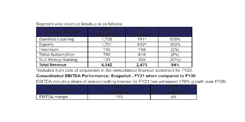 The company has delivered consolidated revenue of Rs 4,542 Mn (unaudited) in FY21 which is 84 per cent growth over FY20 (Rs 2,475 Mn). Gamified learning and esports segments have not only demonstrated strong growth momentum in FY21 but have also laid the foundation for predictable growth on account of proven user engagement and retention KPIs in gamified learning and multiyear media licensing and game publisher agreements in case of Esports.