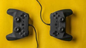 Video game controllers on color background