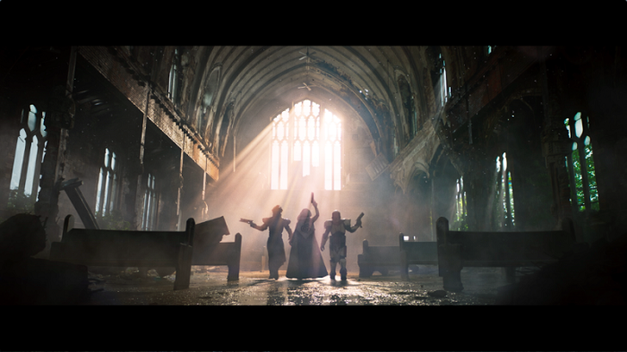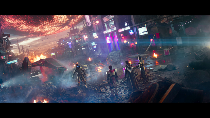 In the opening scene where Cayde-6 rallies his three guardians Titan, Hunter and Warlock, Framestore created a street aesthetic to sure a futuristic dystopia with a combination of neon signs and ruined architecture using a 2.5D matte painting projection technique. The team extended the entire street scene to add depth and the caged Traveler in the background with red accents to showcase the enemies’ master plan at work. In the background it detailed additional battle space ships, explosions and atmospheric considerations like smoke, embers and ash using a combination of Nuke, Maya and Houdini renders.