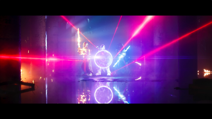 CG weapons, effects and volumetric muzzle flash libraries for each gun were created to correlate with the game character’s weapons of choice, including a fully CG Psion character and gun. Framestore designed CG versions of Hunter’s staff, Warlock’s sword, Titan’s shield and a fiery sword at the end. During the live action production these weapons were represented by LED lights with specific colours. This ensured accurate interactive lighting and reflections during the shoot to facilitate the integration of the CG weapons in post-production. Other weapon effects included CG lasers and speakers in addition to the continual aesthetic of smoke and embers.