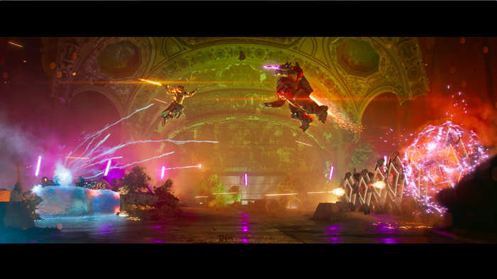 “My favourite sequence is the backlit melée,” says Framestore creative director Alex Thomas. “I love the coherence of the sequence, with action taking place across multiple floors, linked by characters across these divides. But in particular I love the silhouettes against the LED screen.”