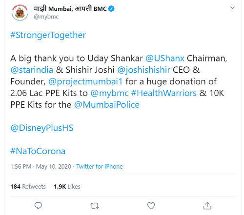 Thus, Star India and Disney+Hotstar have joined hands with Project Mumbai to pledge their support and provide necessary protective gear to the healthcare workers at BMC and Mumbai Police.